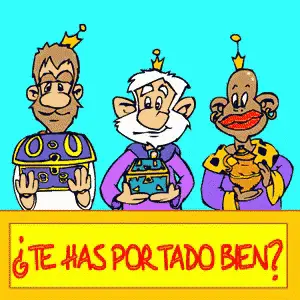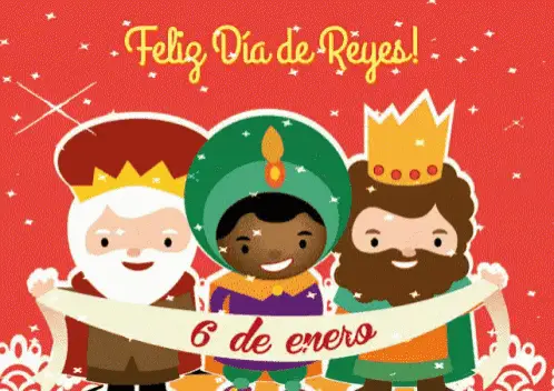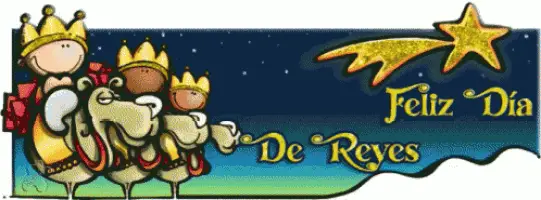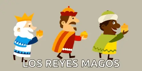 Cartoon illustration of the Three Wise Men riding camels under a star, celebrating Día de Reyes Magos.