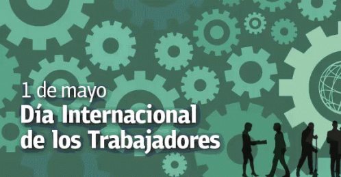 A graphic celebrating May 1st, International Workers' Day, featuring gears and silhouettes of workers.