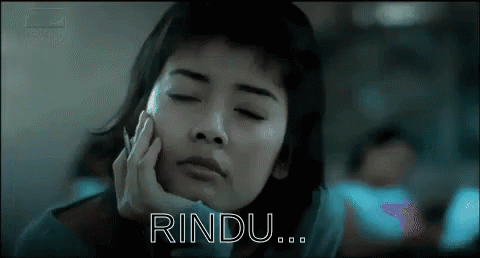 A pensive woman with her hand on her face, expressing deep longing with the word 'RINDU' (MISS) on screen.