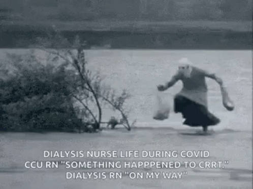 A dialysis nurse rushes through water, meme-style, responding to an urgent call about CRRT during COVID.