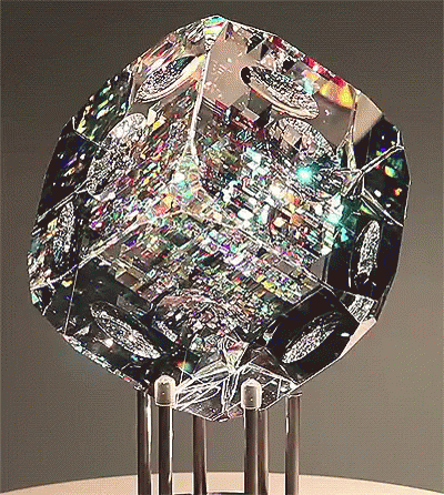A stunning, multi-faceted crystal or diamond-like object sparkles with vibrant reflections on a stand.