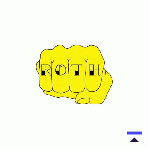 Yellow cartoon fist with 'ROTH' tattooed, sparkling with diamond hands, representing Bitcoin investment.