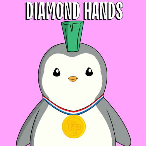 A Pudgy Penguin with a medal and 'DIAMOND HANDS' text, symbolizing holding investments.