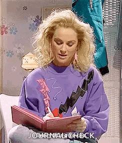Amy Poehler writing in her diary, wearing a purple sweatshirt with 80s-style lightning bolt graphics.