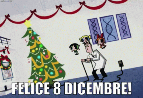 Cartoon man decorates a Christmas tree, celebrating December 8th and the Immaculate Conception.