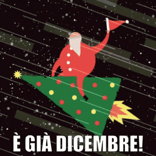 Santa Claus flies through space on a Christmas tree rocket, announcing 'It's already December!'