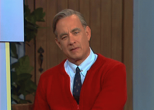 Tom Hanks as Fred Rogers, wearing his iconic red cardigan, looks curious and asks "Did You Hear That?".