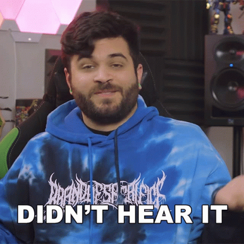 Andrew Baena, wearing a blue tie-dye hoodie, shrugs and says "Didn't Hear It" with a smirk.