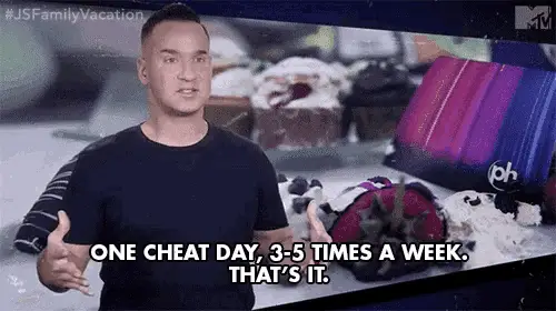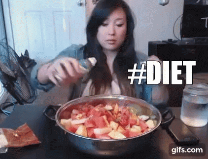 A woman prepares a large bowl of chopped fruit, sprinkling seasoning on it, with the hashtag #DIET.