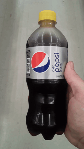 A hand holding a bottle of Diet Pepsi soda with a yellow cap.