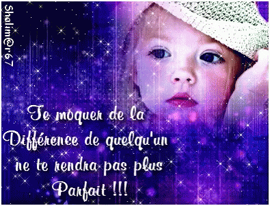 Black and white image of a baby with a French quote: 'mocking someone's difference will not make you more perfect'.