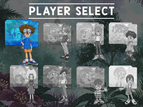 Digimon Adventure player select screen featuring various characters from the anime series.