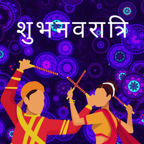 Digital Pratik celebrates Navratri with a man and woman dancing Garba with dandiya sticks against a vibrant purple background.