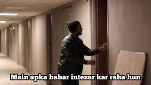 Digital Pratik stands in a hallway, gesturing at a door, with the message 'I am waiting for you outside'.