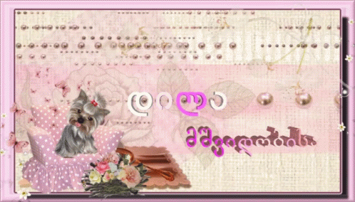 A cute Yorkshire Terrier sits on a pink cushion, accompanied by animated Georgian text: 'Good morning, coffee, flowers'.
