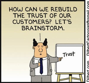 The Pointy-Haired Boss leads a brainstorming session on rebuilding customer trust, with a cynical suggestion from an employee.