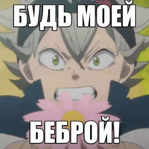 Asta from Black Clover shouts "Be my bebra!" while holding a pink flower, referencing a popular Russian meme.