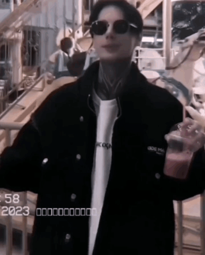 Dima Matveev in sunglasses and a black jacket, holding a drink at what appears to be a fairground.