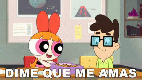 Blossom (Bombon) from Powerpuff Girls asks a boy to tell her he loves her, holding cookies.
