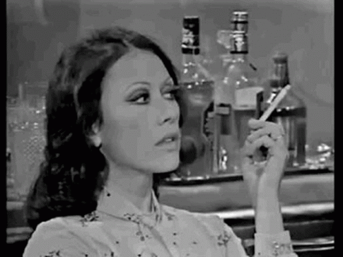 Dina Sfat smokes a cigarette at a bar in a black and white scene from the classic Brazilian novela Selva De Pedra.