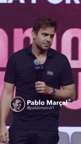 Pablo Marçal speaking on stage about money, with his social media handle visible.