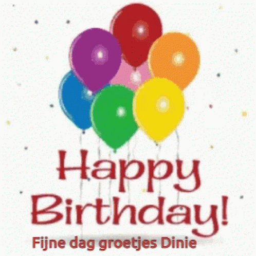 A colorful birthday card featuring balloons and a 'Happy Birthday!' message, with greetings from Dinie.