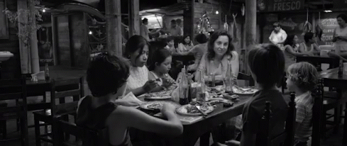Yalitza Aparicio and family share a meal in a restaurant scene from the movie Roma.