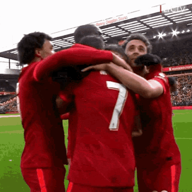 Diogo Jota, Harvey Elliott, James Milner, and other Liverpool FC players celebrate a goal on the field.