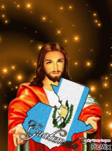 Jesus Christ holds a map of Guatemala, with the phrase 'Dios Bendiga Guatemala' (God Bless Guatemala) displayed.