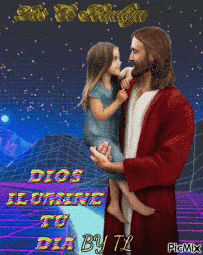 Jesus holding a little girl, with the message 'God Bless You, God Illuminate Your Day' in a retro style.