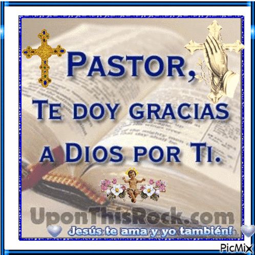 A heartfelt message thanking a pastor, featuring a bible, crosses, and baby Jesus.