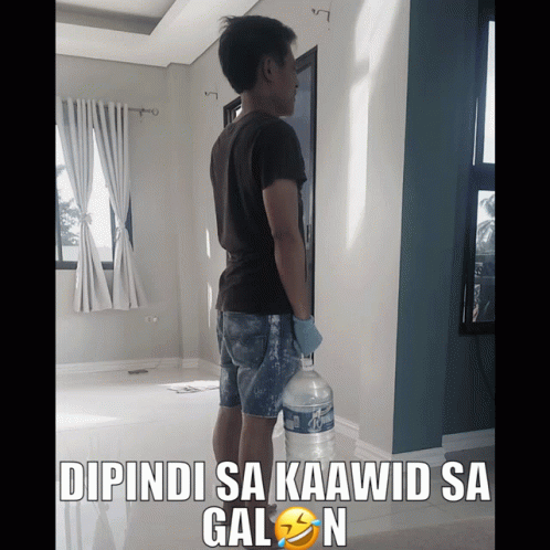 Man humorously lifts a large water gallon, with the caption 'It depends how to bring up the gallon'.