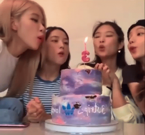 Blackpink members Lisa, Rosé, Jennie, and Jisoo blow out a candle on a two-tiered purple birthday cake.