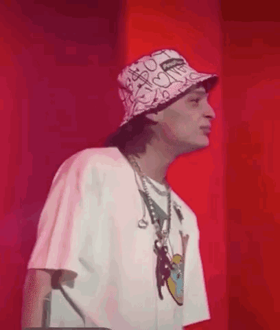 Dipshinn Dipshinn2 on stage, wearing a bucket hat and white t-shirt against a red background.