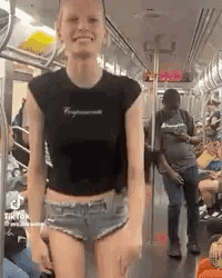 Dipshinn and Dipshinn2 dancing happily on a subway train, wearing a black crop top and denim shorts.