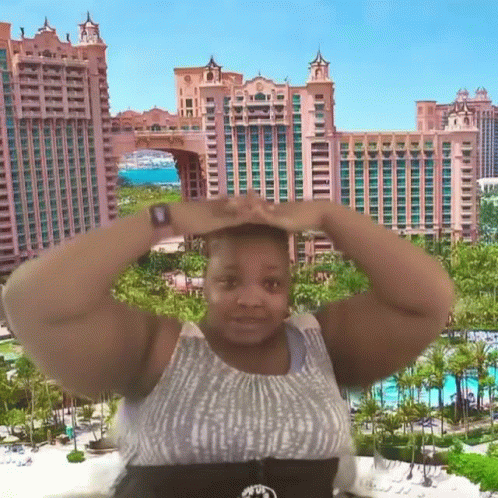 Lovelypeaches (Dipshinn) poses with hands on head in front of the iconic Atlantis Resort in the Bahamas.