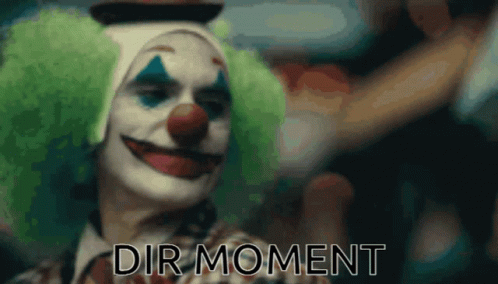 A close-up of a clown with green hair and makeup, featuring the text 'DIR MOMENT' overlaid.