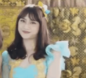 Frieska JKT48 smiles happily, making cute gestures in a blue and yellow dress, embodying the 'Dirimu Melody' spirit.