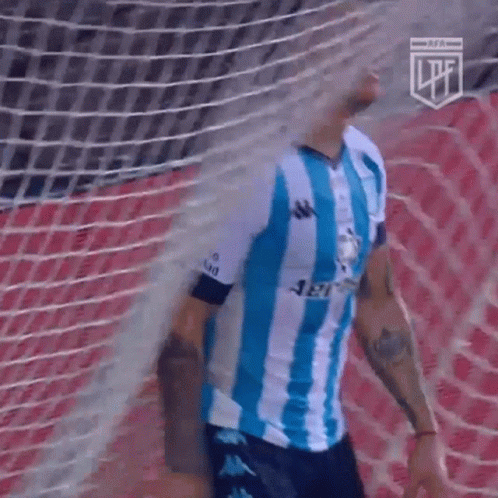 Enzo Copetti, a Racing Club soccer player, shows disappointment near the goal net during a Liga Profesional match.
