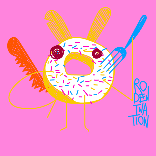 A cartoon donut character with bunny ears, holding a fork and saw, reacts in disbelief as its sprinkles fall off.