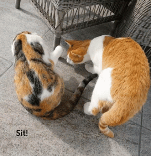 Discat Loya and Phelps, two cats, engage in a playful squabble with one cat seemingly commanding the other to 'Sit!'.