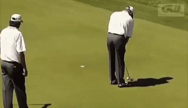 A man in a black shirt and blue shorts throws a disc golf disc on a green course.