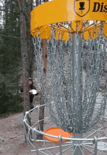 A disc golf player attempts a putt, but the disc hits the chains and spits out of the basket.
