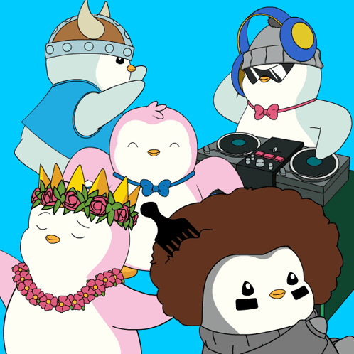 A group of animated penguins having a disco party, with one acting as a DJ.