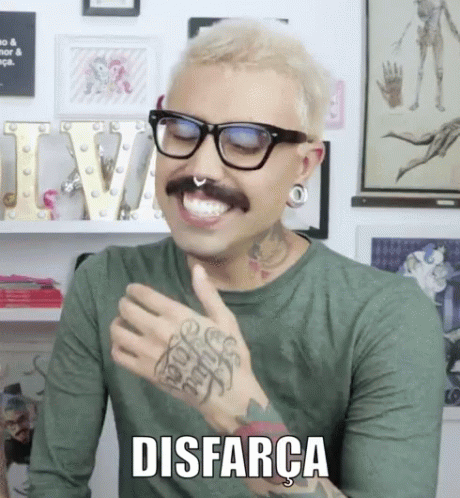 Man in glasses and green shirt with 'Disfarça' text, covering his face and laughing, from Diva Depressão.