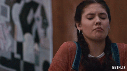 Ronni Hawk, portraying Olivia from On My Block, makes a visibly disgusted and funny face. The Netflix logo is in the background.