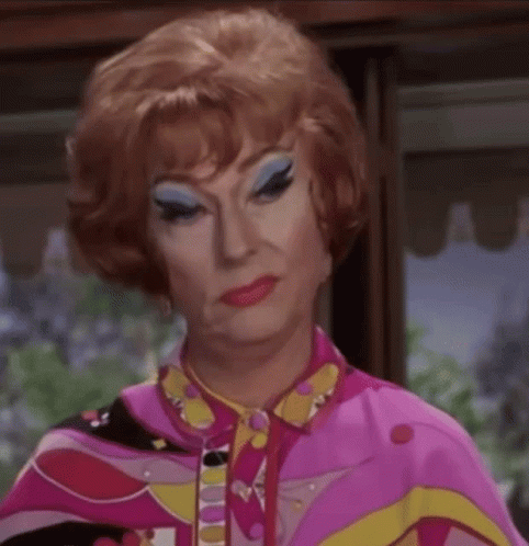 Disgusted Vale as Endora from Bewitched, showing a displeased expression with red hair and striking blue eyeshadow.