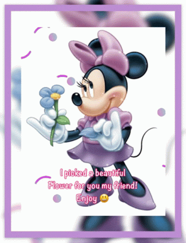Minnie Mouse, a beloved Disney character, offers a beautiful blue flower with a heartwarming message for a friend.