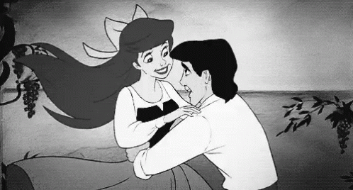 Ariel and Prince Eric share a happy moment in this classic Disney animation, with Ariel sitting on Eric's lap.
