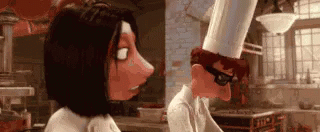Two animated chefs from Disney's Ratatouille, one with dark hair and another in a chef's hat and sunglasses, stand in a kitchen.